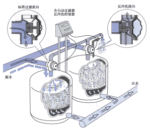 標(biāo)準(zhǔn)設(shè)備的設(shè)計主要采用了以色列進口的過濾器專用三通閥,該閥專為介質(zhì)過濾器應(yīng)用而設(shè)計,工作時原水經(jīng)三通閥直接進入除氧器罐體內(nèi),出水自罐下部進入總出水管。水中溶解氧與海綿鐵發(fā)生化學(xué)反應(yīng)產(chǎn)生不易溶于水的絮狀沉淀被海綿鐵顆粒攔截下來,沉淀積聚在罐體內(nèi)造成水流阻力增大,進出口壓差增大,當(dāng)壓差增加到一定值時(0.05~ 0.07MPa),壓差表向控制器發(fā)出反沖洗信號,A罐電磁閥加電,A罐頂部的三通閥動作(自標(biāo)準(zhǔn)過濾狀態(tài)轉(zhuǎn)為反沖洗狀態(tài)),A罐進水口關(guān)閉,反沖洗口打開;由于B罐此時處于工作狀態(tài),反沖洗水經(jīng)出水口進入A罐底部,經(jīng)罐頂沖洗閥流向排水口,完成反洗動作,控制器控制反洗時間以達到所要求的沖洗效果,一般為3~15分鐘。